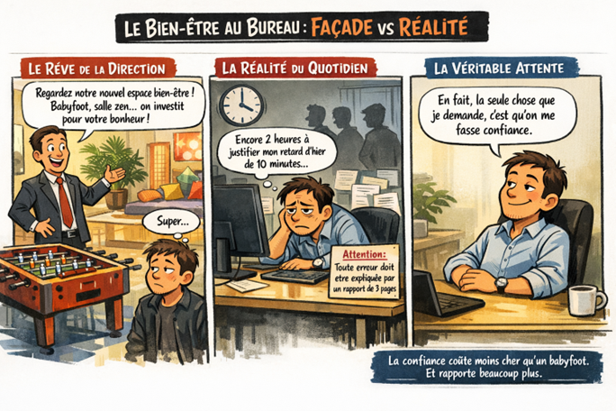 Plutôt que de chercher des solutions miracles pour « injecter » du bonheur, on pourrait essayer un truc radical : arrêter de chercher la recette magique du bonheur et commencer par supprimer les « bugs » qui nous empêchent juste de travailler avec envie. Il s’agit de passer d’une gestion de l’apparence à une architecture de la confiance.