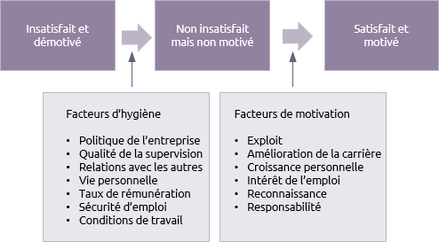 D’un côté, les facteurs dits d’hygiène : conditions matérielles, environnement de travail, avantages, confort, salaire, sécurité. Lorsqu’ils sont absents, ils génèrent de l’insatisfaction. Lorsqu’ils sont présents, ils ne motivent pas pour autant. Ils rendent simplement le travail supportable.